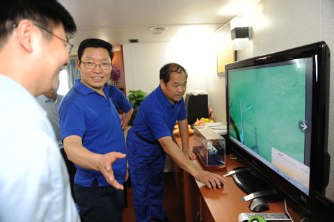 2,蛟龙号海试总指挥刘峰(中)在介绍蛟龙号取得的部分视频成果。