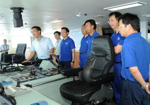 3,科学家们在“海洋六号”船驾驶台前了解各种设备的特点。