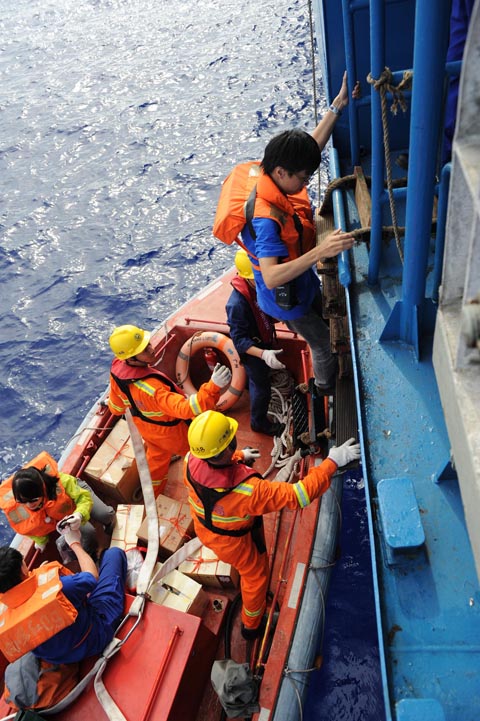 4,专家组成员们乘坐工作艇登上“海洋六号”船。