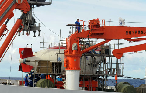 有关专家在对回收上来的蛟龙号进行维护和检修
