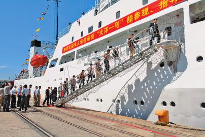 开放日当天,华人华侨代表们正在登上“大洋一号”船进行参观