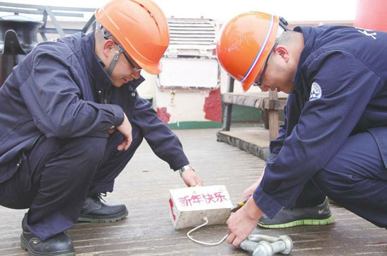 这天是中国的农历除夕,中国大洋第30航次第二航段首席科学家陶春辉特意来到后甲板,看望慰问大家:“新年快乐!大家辛苦!”陶春辉叮嘱设备组人员将事先写好的“新年快乐”标志物搭载在ROV上,让大家在西南印度洋也能感受到过节的气氛。