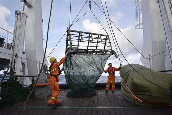 当地时间5月16日16时,“海洋六号”在西太平洋完成首个拖网作业,所获样品达到预期效果。图为科考队员在“海洋六号”后甲板回收拖网设备。(特派记者 刘照/摄)