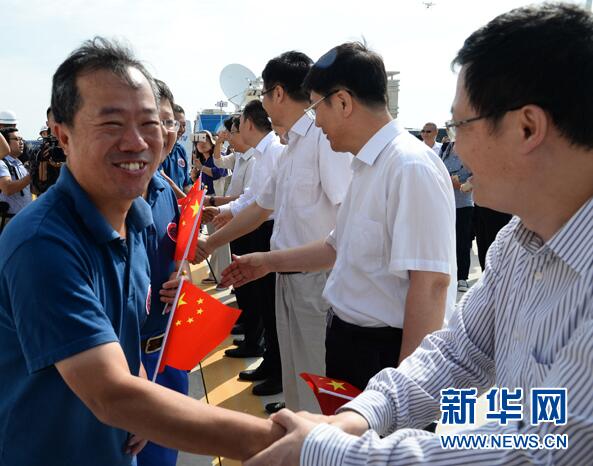 6月23日,科考队员和迎接人员握手。新华社记者张旭东摄